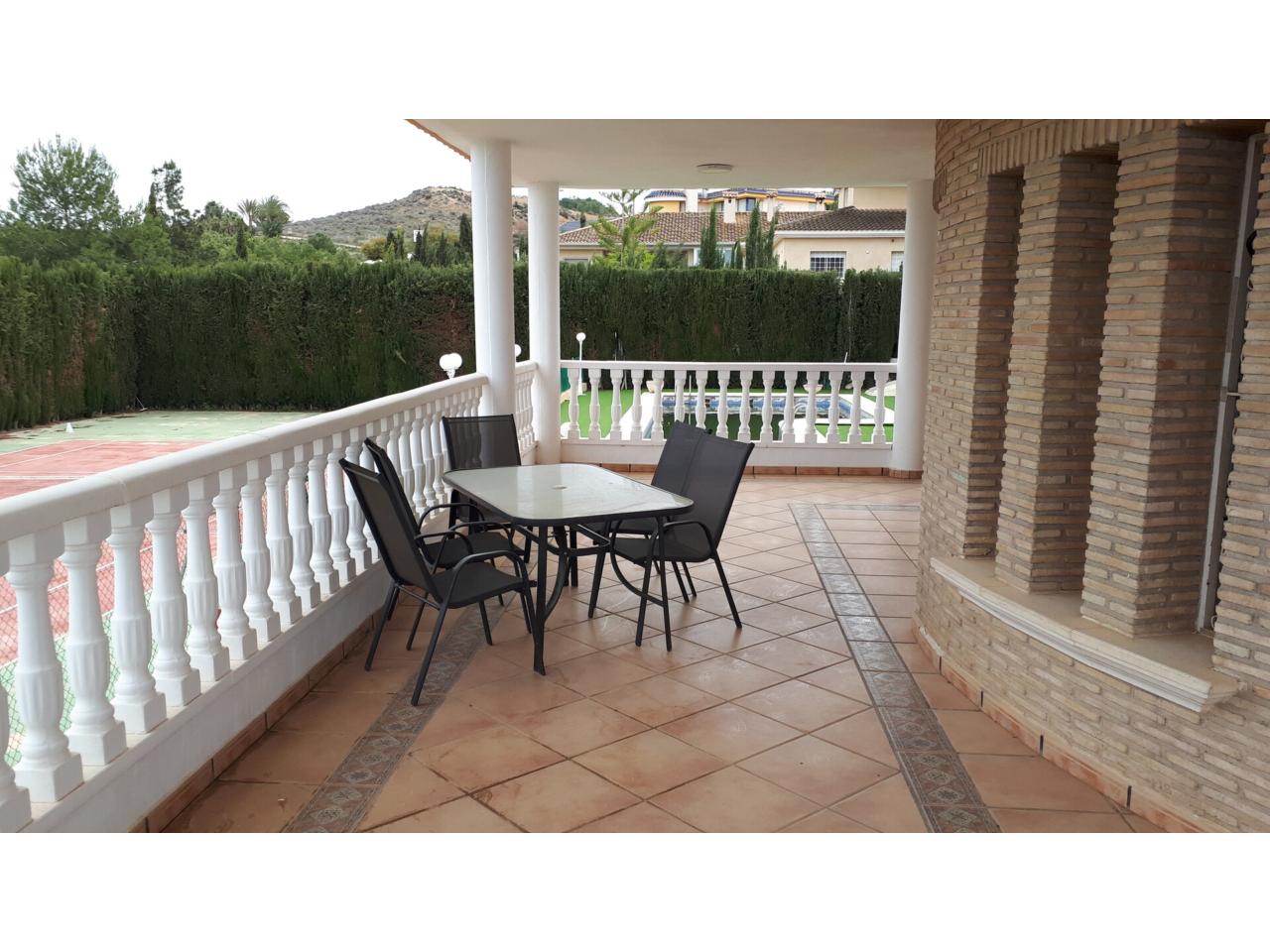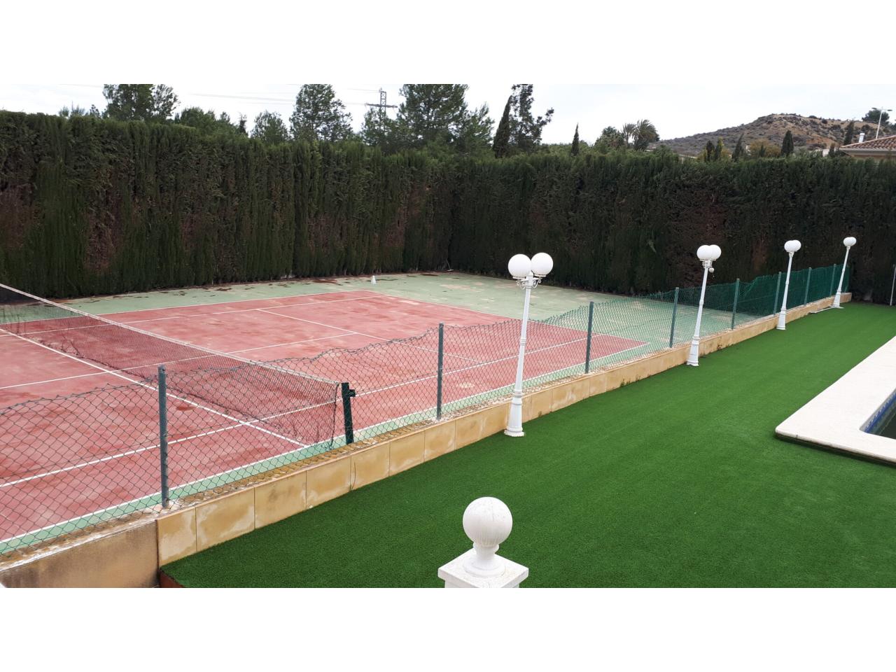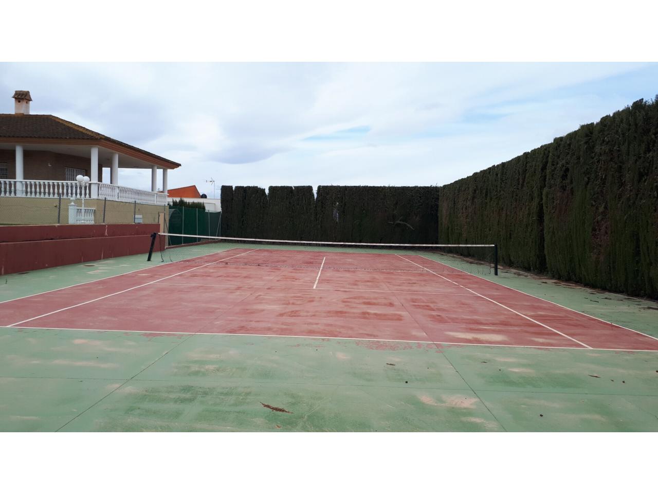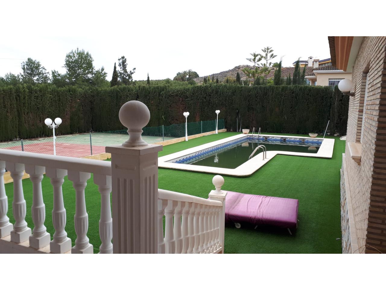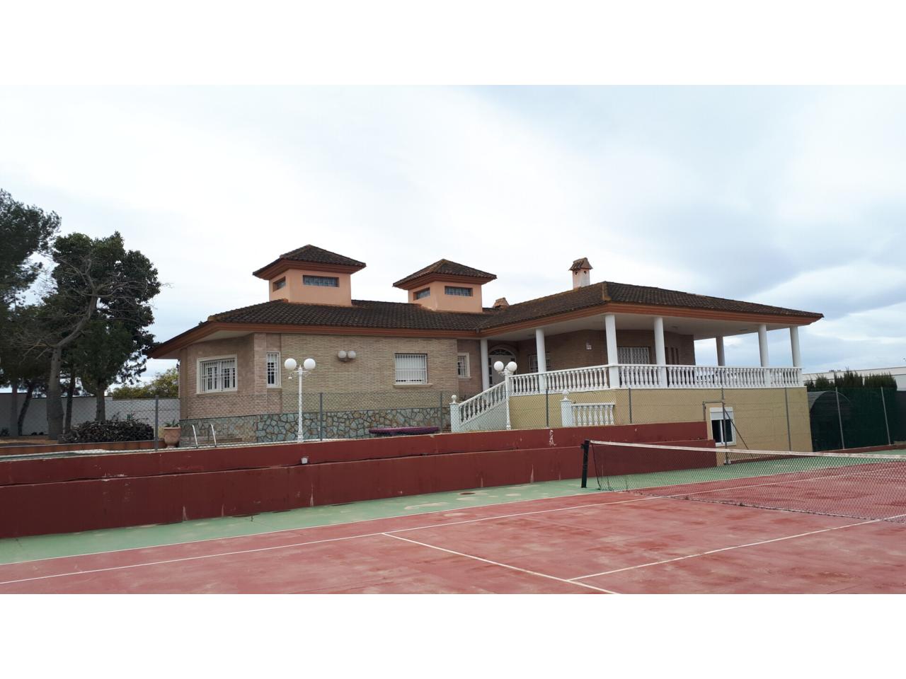Se vende fantástico chalet en La Alcayna, sobre parcela de 2.040 m², con piscina de 70 m², pista de tenis, jardín y amplias terrazas, vivienda construida en 2 plantas con un total de 610 m² ( incluyendo terrazas ) distribuido en planta principal: amplio hall de entrada, salón de unos 40 m² con salida a terraza, cocina independiente de unos 25 m² amueblada con electrodomésticos, lavadero, cuarto de plancha y despensa, 4 dormitorios y 2 baños, dormitorio principal tipo suite con baño y vestidor, todo rodeado de terrazas, planta baja: zona aparcamiento para 6 vehículos, 1 aseo, habitación sala de estar con chimenea y cocina auxiliar, suelos de gres rústico, carpintería interior de pino oregón, armarios empotrados, carpintería exterior PVC blanco con doble cristal, rejas, calefacción por radiadores centralizada en toda la vivienda, luminosa.