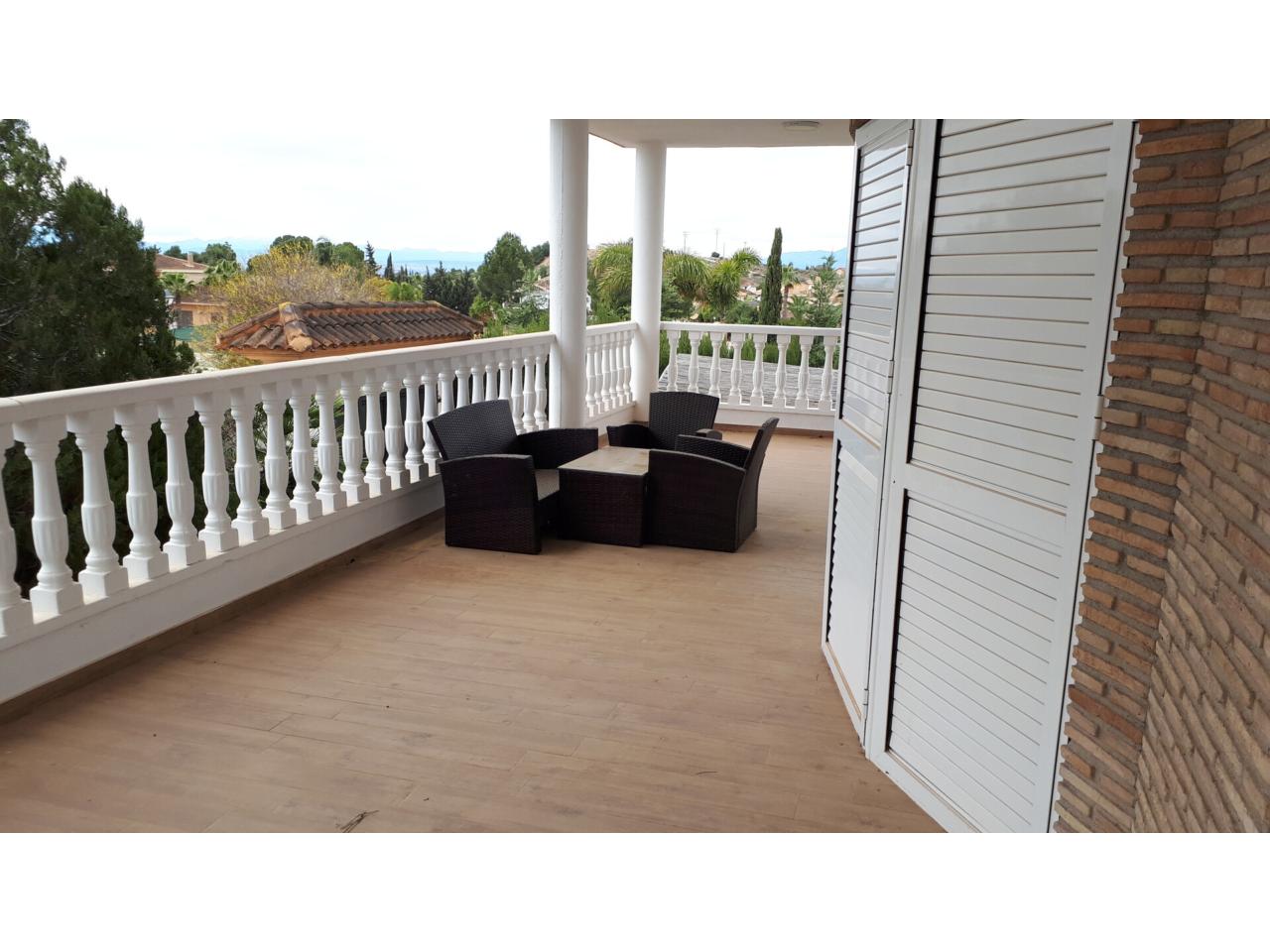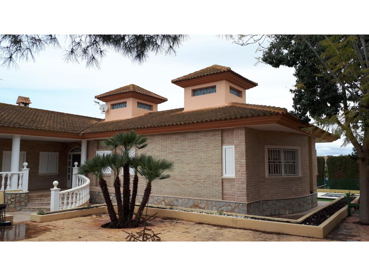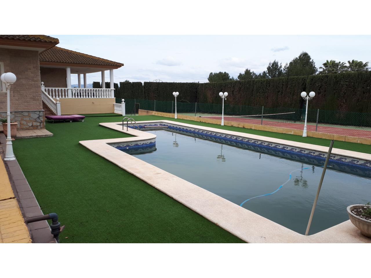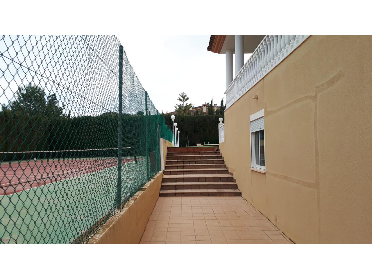 Se vende fantástico chalet en La Alcayna, sobre parcela de 2.040 m², con piscina de 70 m², pista de tenis, jardín y amplias terrazas, vivienda construida en 2 plantas con un total de 610 m² ( incluyendo terrazas ) distribuido en planta principal: amplio hall de entrada, salón de unos 40 m² con salida a terraza, cocina independiente de unos 25 m² amueblada con electrodomésticos, lavadero, cuarto de plancha y despensa, 4 dormitorios y 2 baños, dormitorio principal tipo suite con baño y vestidor, todo rodeado de terrazas, planta baja: zona aparcamiento para 6 vehículos, 1 aseo, habitación sala de estar con chimenea y cocina auxiliar, suelos de gres rústico, carpintería interior de pino oregón, armarios empotrados, carpintería exterior PVC blanco con doble cristal, rejas, calefacción por radiadores centralizada en toda la vivienda, luminosa.