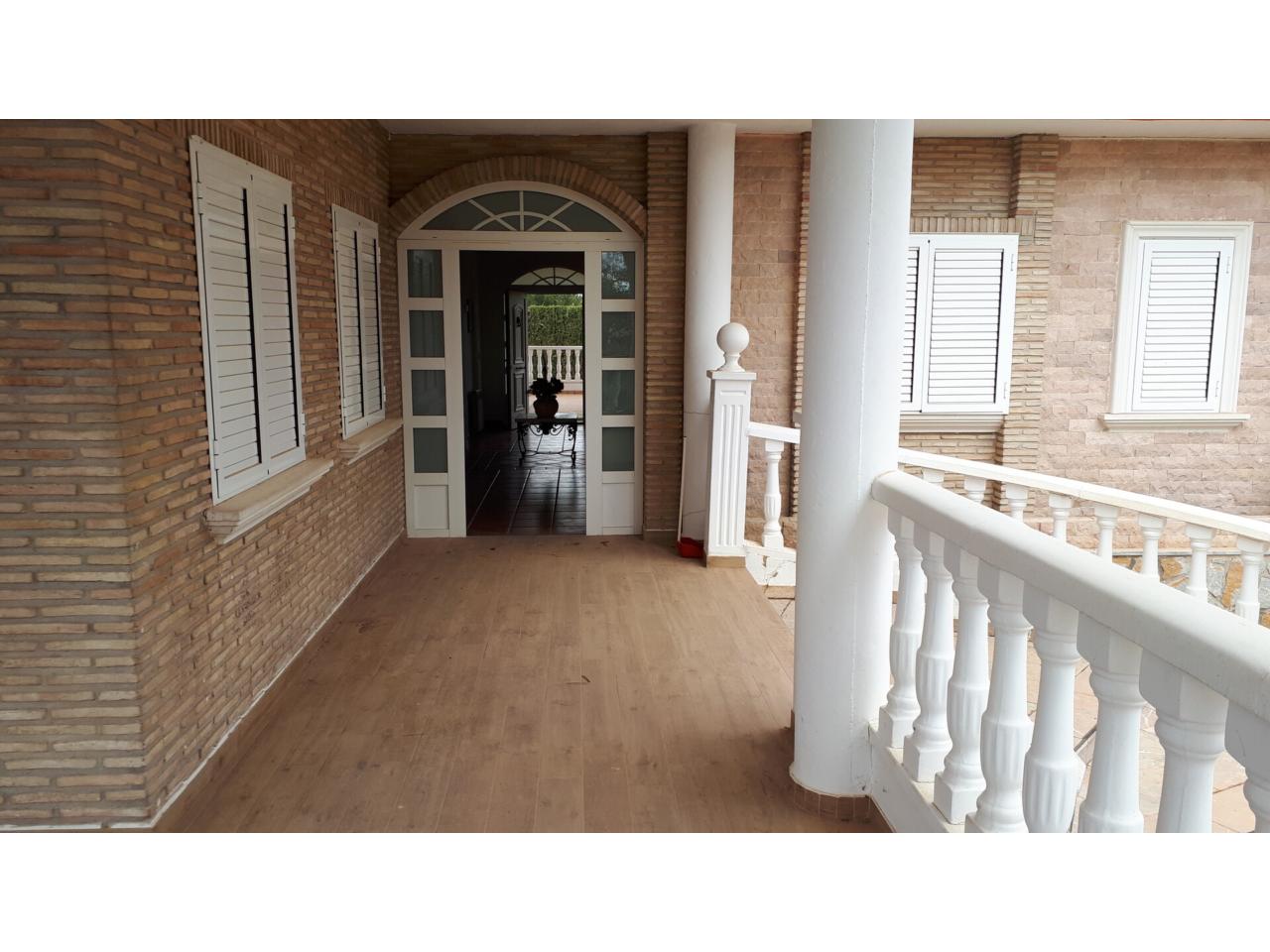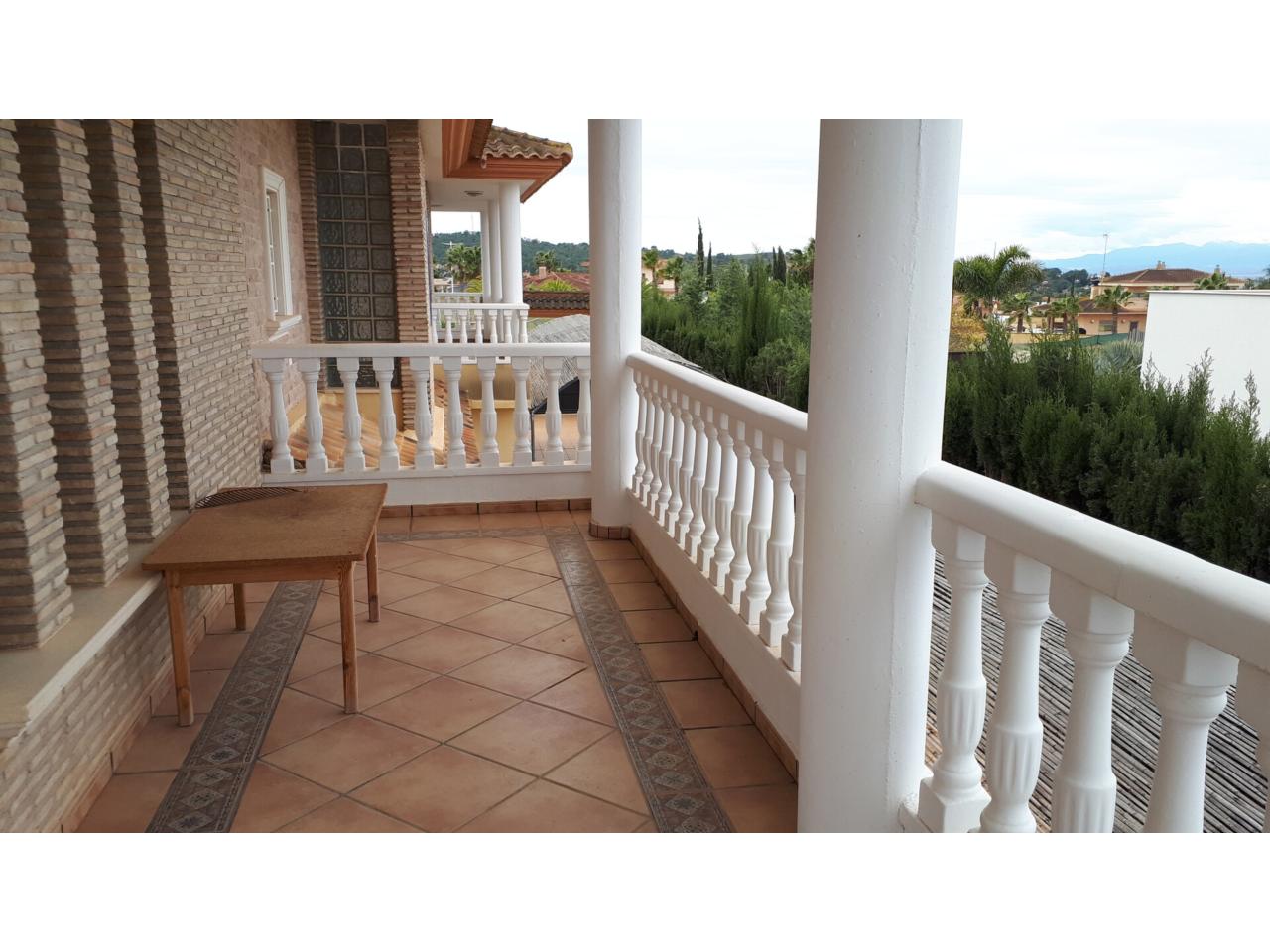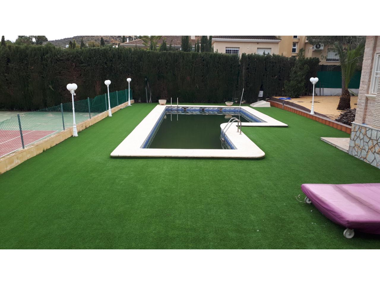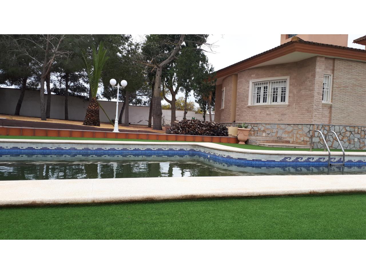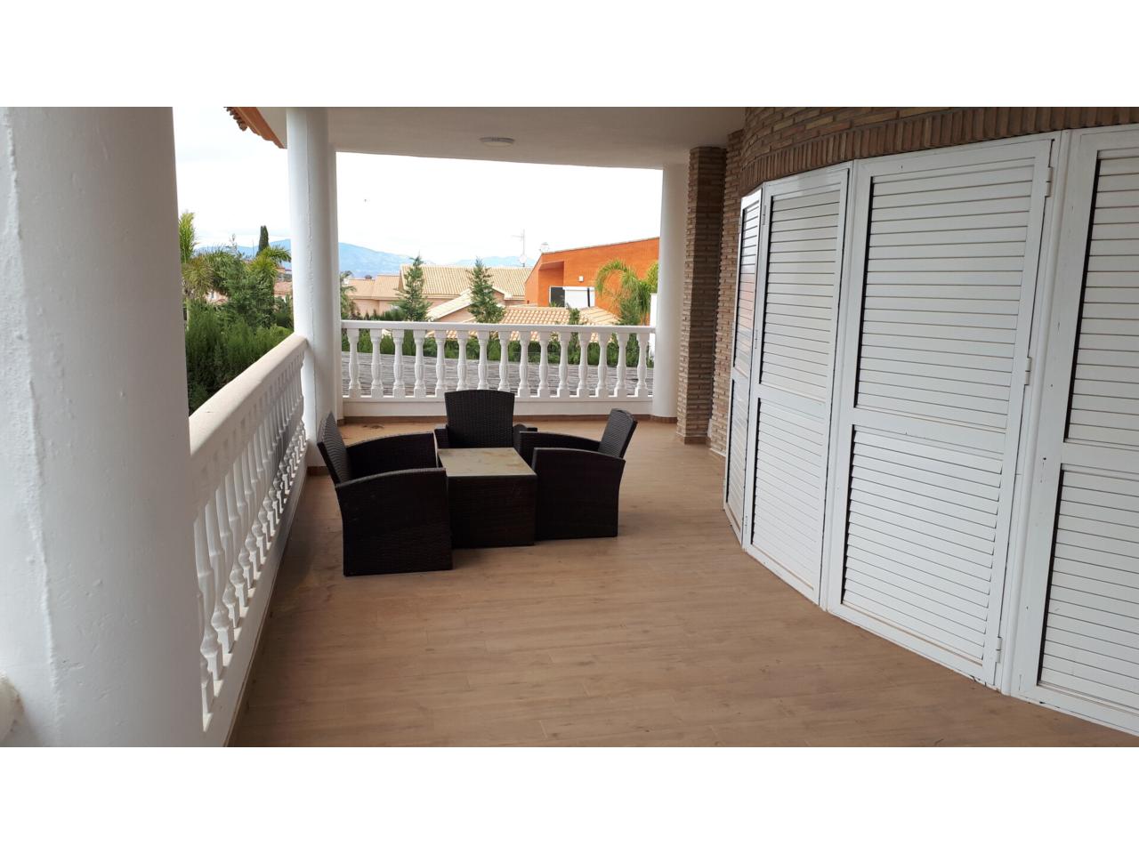 Se vende fantástico chalet en La Alcayna, sobre parcela de 2.040 m², con piscina de 70 m², pista de tenis, jardín y amplias terrazas, vivienda construida en 2 plantas con un total de 610 m² ( incluyendo terrazas ) distribuido en planta principal: amplio hall de entrada, salón de unos 40 m² con salida a terraza, cocina independiente de unos 25 m² amueblada con electrodomésticos, lavadero, cuarto de plancha y despensa, 4 dormitorios y 2 baños, dormitorio principal tipo suite con baño y vestidor, todo rodeado de terrazas, planta baja: zona aparcamiento para 6 vehículos, 1 aseo, habitación sala de estar con chimenea y cocina auxiliar, suelos de gres rústico, carpintería interior de pino oregón, armarios empotrados, carpintería exterior PVC blanco con doble cristal, rejas, calefacción por radiadores centralizada en toda la vivienda, luminosa.