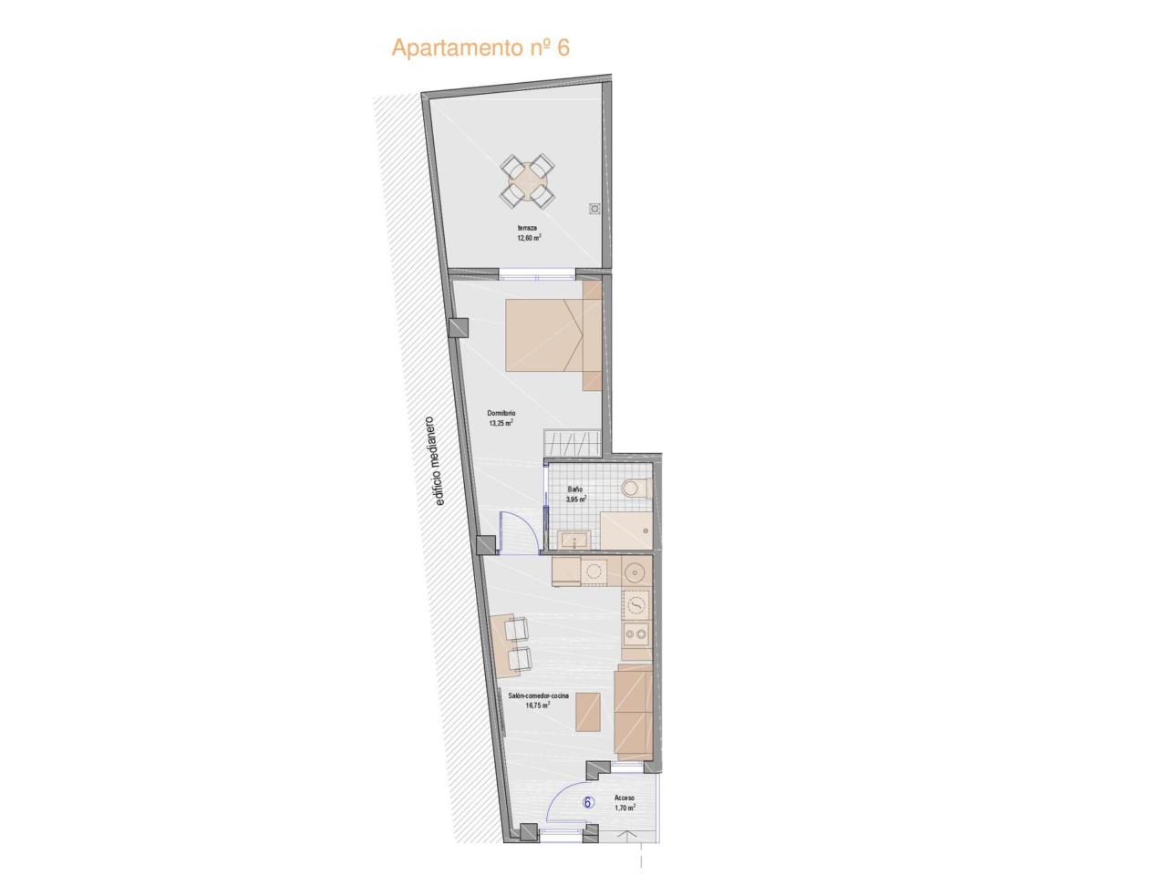 Este apartamento de 54m² construidos aproximadamente se compone de salón-comedor-cocina, 1 habitación con salida a una terraza de 12m² aprox. y 1 baño.