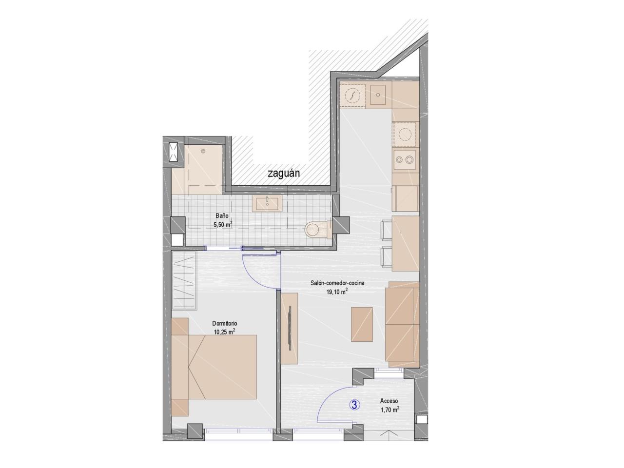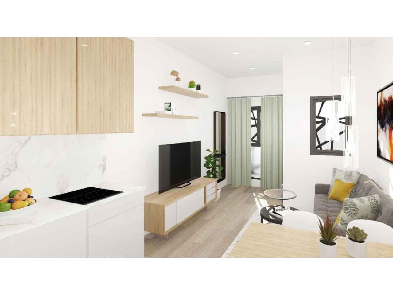 Este apartamento de casi 44m² construidos se compone de salón-comedor-cocina, 1 habitación y 1 baño.