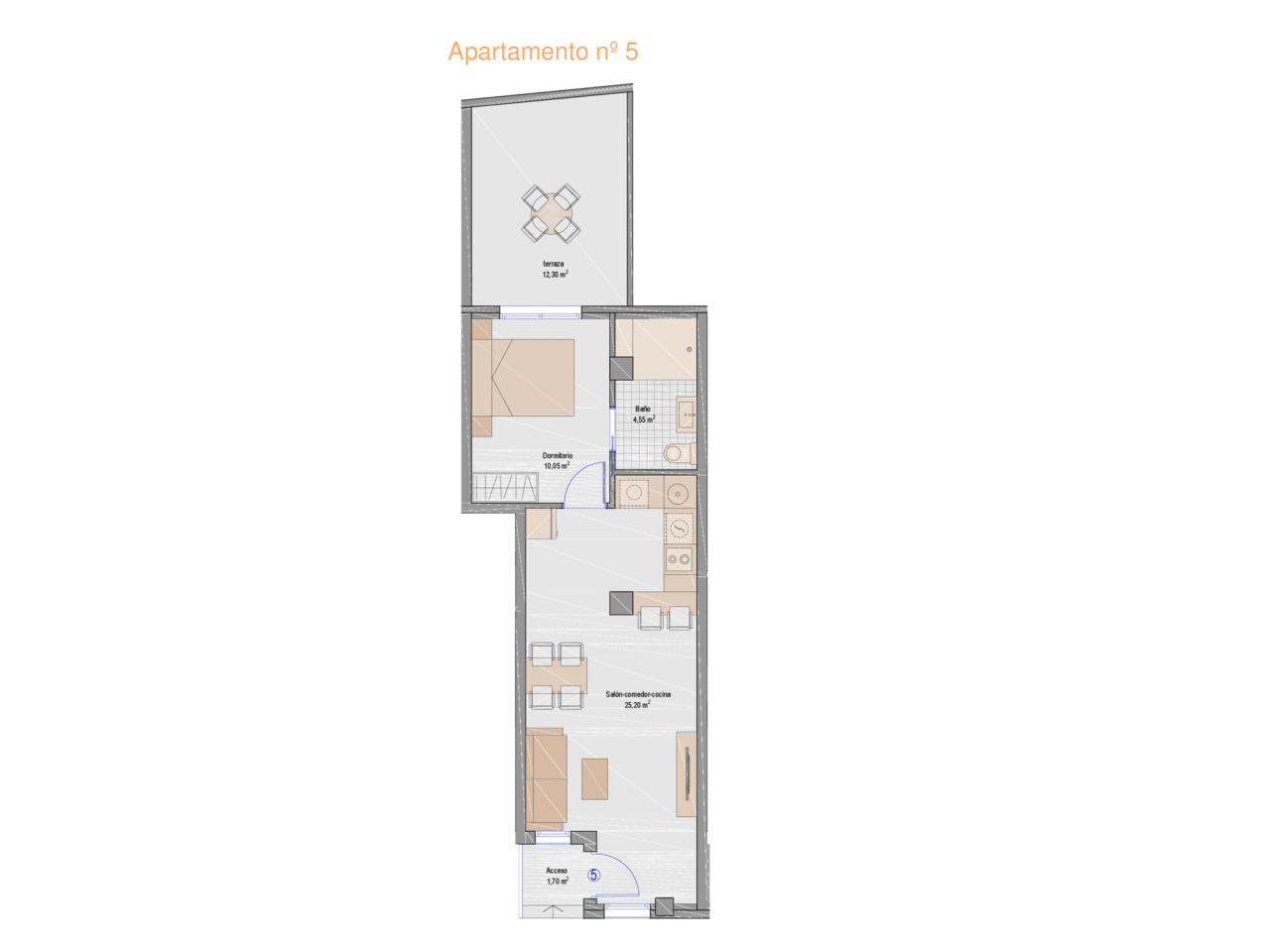 Este apartamento de casi 60m² construidos se compone de salón-comedor-cocina, 1 habitación con salida a una terraza de 12m² aprox. y 1 baño.
